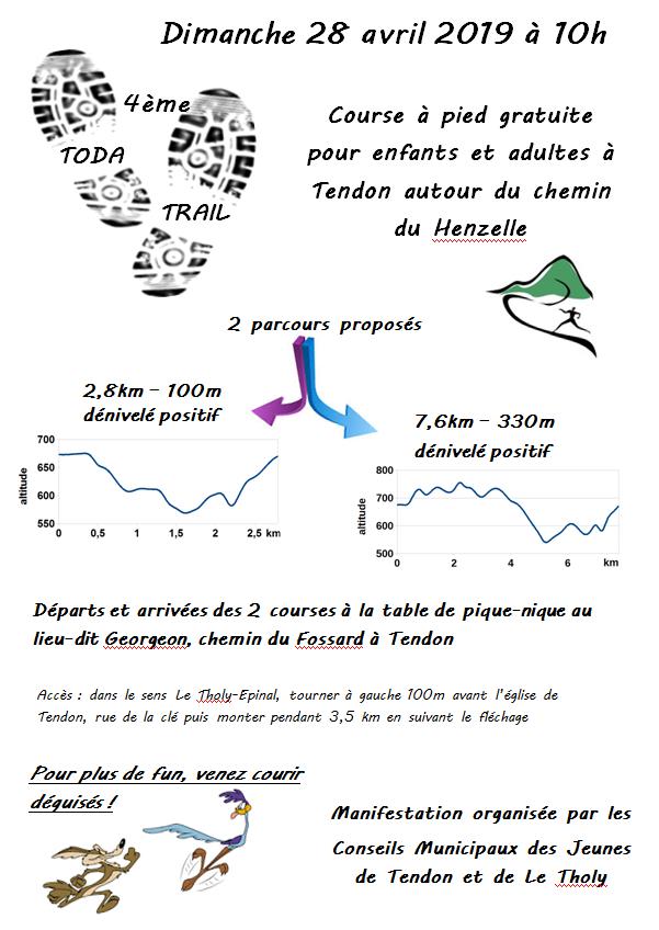 Le Conseil Municipal des Jeunes de Tendon organisera le dimanche 28 avril 2019 le 4ème Toda Trail. Il s’agit d’une course nature ouverte à tous et gratuite. Cette année encore le parcours sera différent des précédentes éditions afin de faire découvrir à tous les nombreux chemins que recèle notre village.